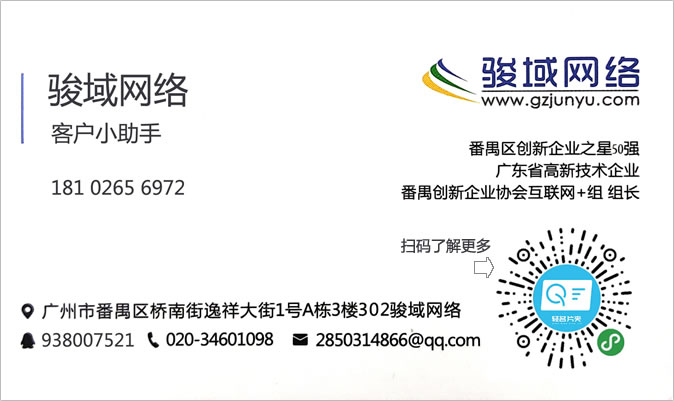 廣州駿域網絡科技有限公司成立于2005年,是一支由眾多具有多年實踐經驗的專業(yè)人士組成的高新技術團隊,專為企業(yè)提供網站建設、全網營銷、郵箱等服務,我們擁有嚴謹的程序開發(fā)人員、專業(yè)的美工設計、隨時為您效勞的售后服務人員,團隊人數達一百多人。目前我們已經榮幸的為廣州眾多知名企業(yè)提供了包括網站建設、手機網站、小程序、企業(yè)軟件開發(fā)等多種基于互聯(lián)網技術的服務。 通過長期積累,駿域網絡目前已經擁有50000多家客戶。